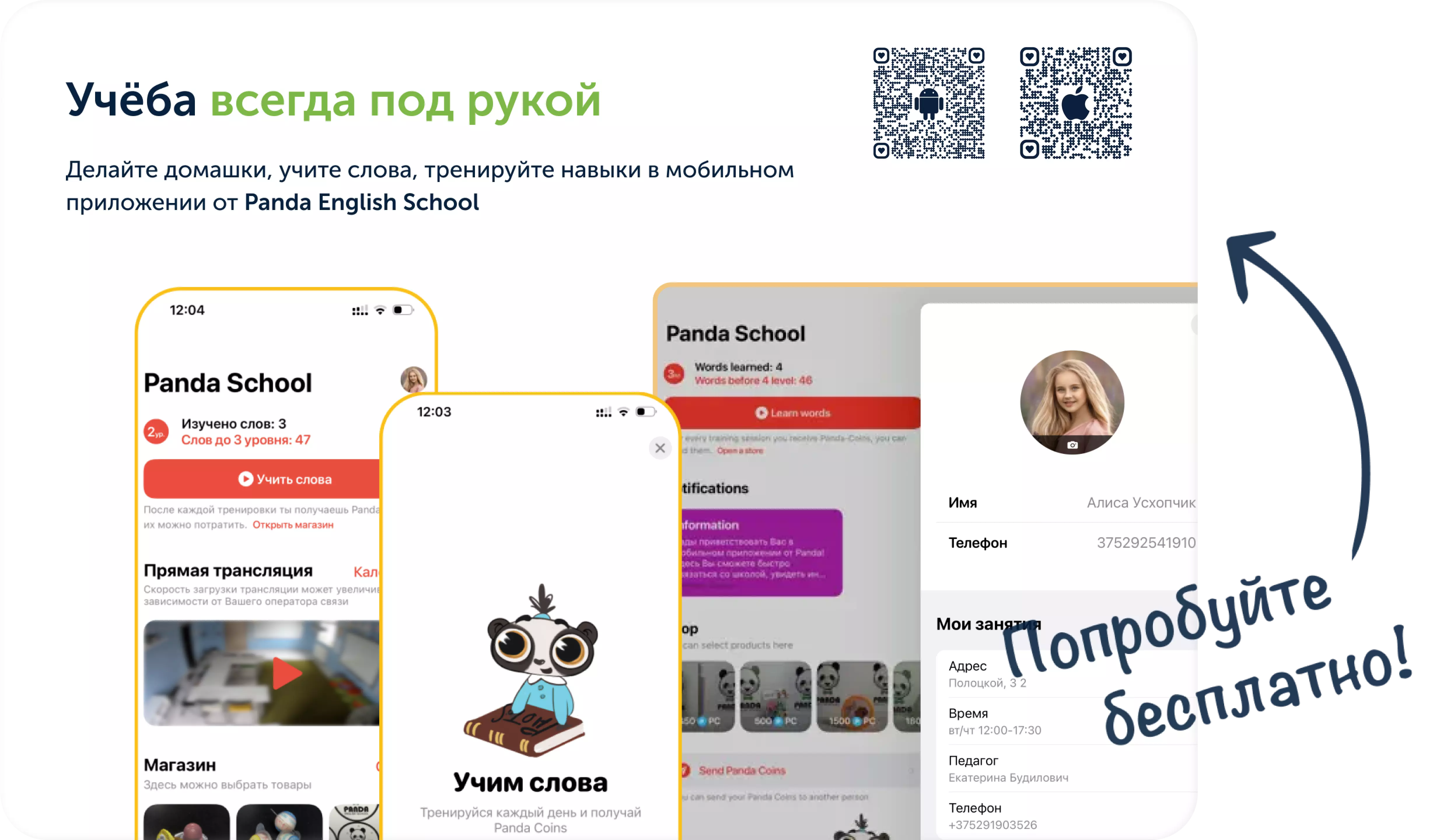 В Panda English School изучают английский язык на базе учебных пособий лучших английских издательств, таких как OXFORD, McMillan, Pearson. В школе используют учебники серий — Happy House, First Friends, Go Getter, Focus, Spark, Family&Friends, New English File.
